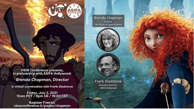 Director of The Prince of Egypt & Brave in virtual conversation with Frank Gladstone, Executive Director ASIFA Hollywood Friday, July 2nd, 2021 at 10am PST / 6pm UK / 19:00 CET In a special live event, Brenda Chapman, director of “The Prince of Egypt” and the Academy Award-winning “Brave,” takes part in a virtual conversation with Frank Gladstone, executive director of ASIFA-Hollywood. Join them for a lively discussion about animation and storytelling, in this online session presented by VIEW Conference in partnership with ASIFA-Hollywood.